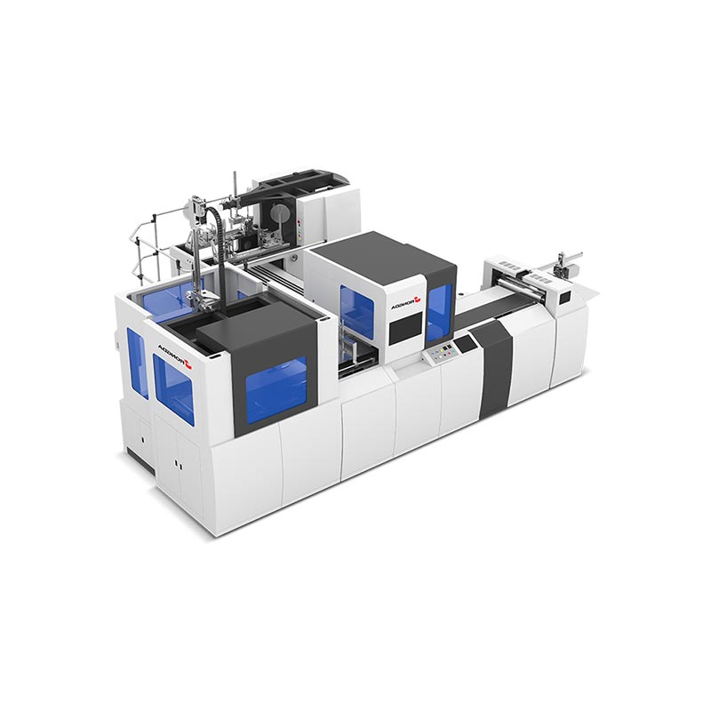 sistem za podajanje kartona in visoko natančno zgibalno napravo, podpira dvojno obdelavo za oblikovanje toge škatle in
